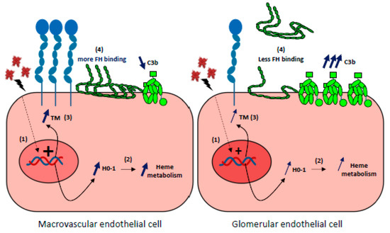 Glomerular endothelial cells susceptibility to hemolysis (1) Upon hemolysis, glomerular endothelial cells display a weaker capacity than macrovascular or other microvascular EC to upregulate the expression of HO-1 and thrombomodulin (TM) genes. (2) Subsequent relative deficiency in HO-1 will result in a stronger heme-mediated complement activation on the endothelium. (3) Weaker expression of TM will aggravate the pro-coagulant phenotype of ECs and increase complement activation as TM is a negative regulator of the complement system. (4) FH binding to heme-exposed, glomerular ECs is decreased compared with macrovascular Ecs, and will result in a more important complement activation on ECs.