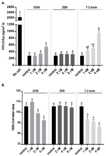 Effects of deoxynivalenol (DON), T-2 toxin, and zearalenone (ZEN) exposure on the integrity of the BeWo cell monolayer. The changes in (A) transepithelial electrical resistance (TEER) and (B) fluorescein isothiocyanate-dextran (FITC-D) flux from apical to basolateral compartment after 24 h exposure to mycotoxins at the apical side are shown. Data are expressed as the mean ± SEM of three independent experiments, each performed in triplicate. Different lowercase letters denote significant differences among groups. (p < 0.05).