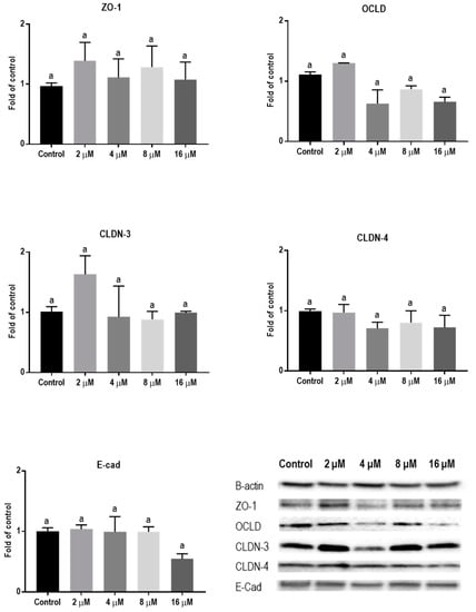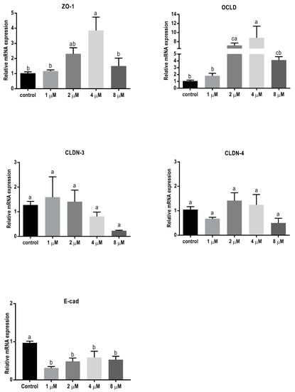 The lower concentrations of ZEN showed no significant effect on mRNA level of all tight junctions (TJ) and E-cadherin (Figure 4), but the higher concentrations caused a reduction in mRNA levels of ZO-1, CLDN-4, and E-cadherin.