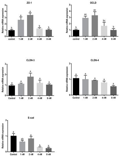 Effects of T-2 toxin exposure on mRNA levels of junctional proteins in BeWo cells. The mRNA expression of occludin (OCLD), zonula occludens protein-1 (ZO-1), claudin (CLDN)-3 and 4, and E-cadherin (E-cad) in BeWo cells after 24 h exposure to different concentrations of T-2 toxin. Data are expressed as the mean ± SEM of three independent experiments, each performed in triplicate. Different lowercase letters denote significant differences among groups (p < 0.05).