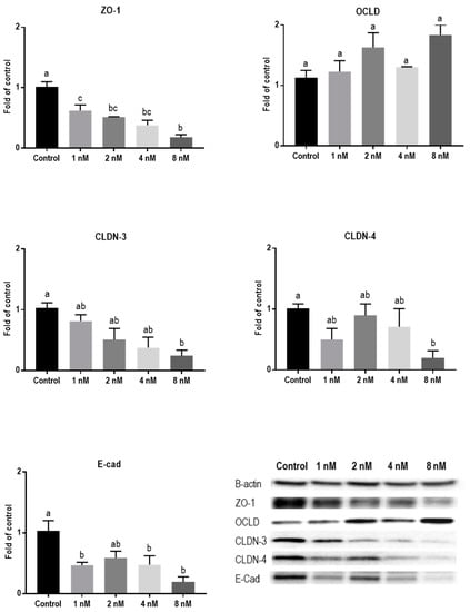 Effects of deoxynivalenol (DON) exposure on junctional proteins in BeWo cells. The protein expression of occludin (OCLD), zonula occludens protein-1 (ZO-1), claudin (CLDN)-3 and 4, and E-cadherin (E-cad) in BeWo cells after 24 h exposure to different concentrations of DON. Data are expressed as the mean ± SEM of three independent experiments, each performed in triplicate. Different lowercase letters denote significant differences among groups (p < 0.05).