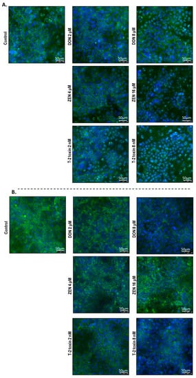 Effects of deoxynivalenol (DON), T-2 toxin, and zearalenone (ZEN) exposure on (A) occludens protein-1 (ZO-1) and (B) E-cadherin localization in BeWo cells, visualized by immunofluorescence staining (400× magnification). Scale bars represent 50 μm.