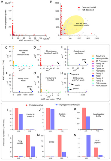 To further compare transcript abundance values between Platymeris rhadamanthus and Pristhesancus plagipennis, we compared their venom gland transcriptomes using reciprocal BLAST searches, revealing 57 pairs of putative orthologues, each member of which is confidently identified in venom by MS (Supplementary Data S3). 51 of these orthologue pairs (89%) showed a similar pattern of transcript abundance values between the AMG and PMG in both species (e.g., Figure 1I–M), whereas only six have contrasting patterns (e.g., Figure 1N). Although additional biological replicates would be required to confirm these data, they suggest conservation of numerous venom system traits between these two assassin bug species, and support our previous reports of venom-gland specialisation in other heteropteran species [15,19].