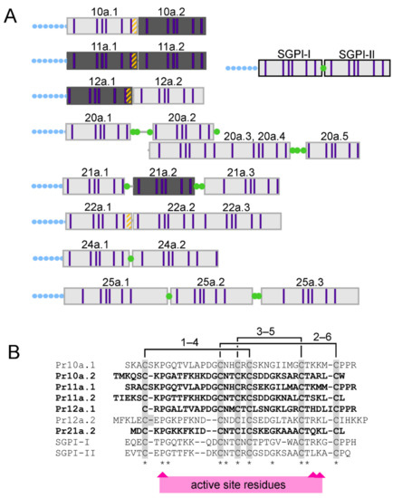 The remaining five disulfide-rich peptides, each with molecular mass 3.7–4.2 kDa, corresponded to a single domain of a multidomain pacifastin precursor (Figure 2; see Section 2.1). Comparison of the mature primary structures with the venom-gland transcriptomic data revealed that the single-domain pacifastin venom peptides were derived by proteolytic processing of a larger precursor, similar to the ‘multifunctional warhead’ precursors we described in centipede venom systems [23]. Although we previously detected polypeptides with pacifastin-like disulfide-rich repeats in the venoms of harpactorine assassin bugs [14,15], these consisted of much longer multidomain repeat precursors, and the mature form of the polypeptides are unknown. Indeed, the Platymeris rhadamanthus pacifastin peptides Pr10a–Pr12a and Pr20a–Pr24a were not recovered as orthologous to pacifastin domains previously detected in assassin bug venom (Supplementary Data S3) and, instead, show greater BLAST homology and more similar precursor architecture to peptides of ~4 kDa that have been isolated from orthopteran insects such as Locusta migratoria and Schistocerca gregaria [24,25,26]. Whereas almost all known insect single-domain pacifastin peptides are processed by cleavage at dibasic sites [27], our transcriptomic and MS data indicated that many Platymeris rhadamanthus venom pacifastins are cleaved at monobasic sites, especially following Pro-Pro-Arg sites such as those that occur in Pr10a, Pr11a, and Pr12. In contrast to dibasic pacifastin cleavage sites, these PPR sites were observed to be retained at the C-terminus of the mature peptides U-RDTX-Pr11a.1 and U-RDTX-Pr12a.1 (Figure 2). Residues reported to be important for serine protease inhibition activity [27] showed variable conservation, making it unclear if these peptides are functional serine protease inhibitors or performed other roles.
