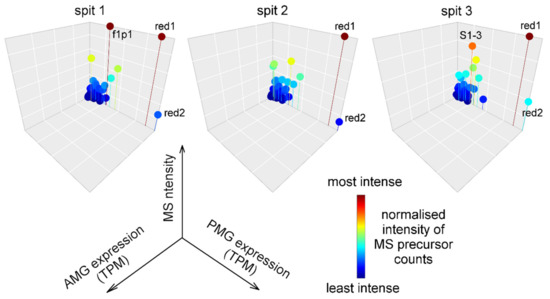 Since we previously demonstrated that harassment of Pristhesancus plagipennis elicits the secretory products of the AMG (but not the PMG), we hypothesised that venom propelled defensively by Platymeris rhadamanthus might be partly or wholly produced by the AMG. To test this, we used LC-MS/MS to analyse three samples of venom defensively propelled by three individual bugs. However, we did not find any support for this hypothesis. All three samples of propelled venom primarily contained proteins that had higher estimated transcript abundances in the PMG compared to the AMG (Figure 4). This trend was highly statistically significant (Kruskal–Wallis test on TPM values of detected proteins in PMG and AMG gives p < 10−19 in each case). All three samples showed maximum protein signal originating from redulysin 1. These results suggest that venom propelled defensively was produced in the PMG.
