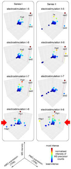 Glandular origin of venom harvested by electrostimulation. Two series of venom samples collected from single individuals consecutively over the course of a single venom harvest. Tandem mass spectrometry (MS) analysis of the final four samples of each series are shown. Gridlines on the x and y axes represent 20000 transcripts per million (TPM), and on the z axis 20% of maximum. Labels red1 and red 2 indicate Redulysins 1 and 2; f1p1 and f1p2, Heteropteran venom protein family 1 proteins 1 and 2; 1a, peptide Pr1a; h1, Haemolysin-like protein 1; f16p1, Heteropteran venom protein family 16 protein 1. Red arrows show final sample with composition differing from those previous.