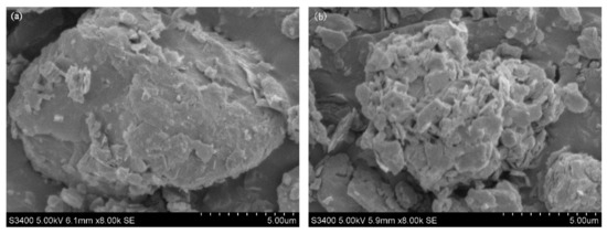 The morphology of albite before (NA) and after (OA) modification was characterized by SEM imaging. As shown in Figure 1, both NA and OA are large particles. The surface of NA was relatively flat and smooth; a regular and compact stacked lamellar structure was observed with thicker lamellae and fewer pores. After CPC treatment, the particle size and structure of OA were remarkably altered by forming more holes and cracks with more exfoliated, loose, and curled layers. The view from the side shows that there is a certain distance between the layers, accompanied by some sharp edges, and there are more fine particles between the layers. The surface morphology directly affects the adsorption capacity for heavy metal ions and organic pollutants. The structure of OA showed favorable channels and voids for adsorbing ZEN.