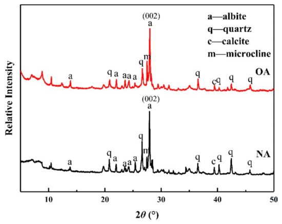 The crystal structures of the materials were characterized by XRD. In Figure 2, the XRD diagram demonstrates that the diffraction peak at 2θ = 27.93° was the typical diffraction peak of albite. The basal spacing of natural NA was 3.19 Å, indicating the 0 0 2 plane of albite. Moreover, it has been confirmed from the diffractograms that small amounts of quartz, calcite, and microcline can be found in NA and OA. The XRD patterns showed that the diffraction peaks of OA were the same as those of NA, which indicated that the introduction of CPC had no impact on the transformation of the crystal phase structures. However, a slight decrease in peak sharpness for the samples was observed after modification, indicating that the crystallinity changed slightly after the CPC treatment process. These findings suggest that the grafting sites mainly occur on the outer surface, but less between the interlayers, which might be due to the restriction of the NA molecular structure by the modifier entering the interlayer.
