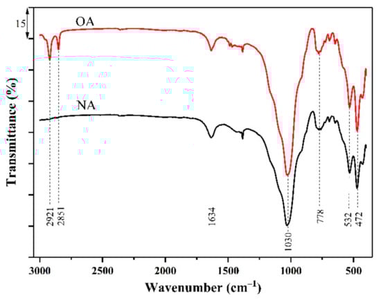 The FTIR spectra of NA and OA are presented in Figure 3. The change in structural orderliness can be determined by the increase in intensity, number, and sharpness, as well as by the shifts in band frequencies of the peaks [19]. It is known that the main infrared characteristic peaks of albite occur at 400–1300 cm−1 [27]. In this range, there were four similar bands in the starting albite and organoalbite samples, which appeared at approximately 472, 532, 778, and 1030 cm−1. The two obvious peaks centered at 472 cm−1 and 532 cm−1, represented the bending vibration of Si–O–Si and the coupling between the O–Si–O deformation and the Na–O stretching, respectively [27,28]. The band at 778 cm−1 was attributed to Si–O–Si bending vibrations, while the Si–O symmetric bond stretching bands could be seen in the region of 900–1200 cm−1 centered at 1030 cm−1 [19,29]. Furthermore, the peak centered at 1634 cm−1 and 3453 cm−1 correspond to the bending and stretching vibrations of water molecules [17,30]. This meant that there were H-bonded hydroxyls and physically adsorbed water attached on the albite and organoalbite surfaces. However, the bands between 2800–3000 cm−1 associated with the symmetric and asymmetric CH2 stretching modes of the alkyl chain were particularly present in OA, indicating that surfactant molecules have successfully inserted NA [17,30].