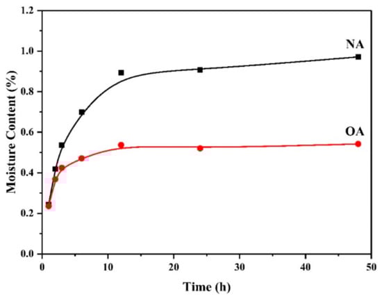 The surface hydrophobicities of NA and OA are shown in Figure 5. NA and OA exhibited continuous mass gain within 12 h and then tended to be stable. The final moisture adsorption capacities dropped from 0.97% for NA to 0.54% for OA, which inferred that hydrophobicity of OA increased. This was beneficial to capture the nonpolar, hydrophobic molecule ZEN through hydrophobic interaction.