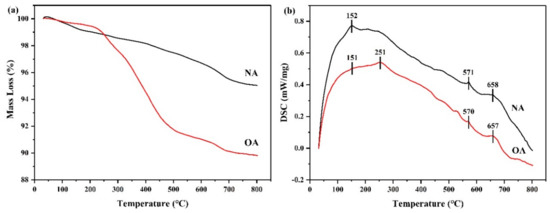 Thermal analysis (TG–DSC) was conducted to evaluate the thermal properties of albite samples before and after modification. The thermogravimetric (TG) and differential scanning calorimeter (DSC) curves of the NA and OA are presented in Figure 6a,b, while their mass losses in different temperature regions are shown in Table 3. The mass loss was divided into three parts: (1) Mass loss observed in the temperature range of 25 to 200 °C represented the desorption of adsorbed water on the surface [35,36]; (2) mass loss observed from 200 to 500 °C was attributed to the removal of chemically combined water molecules or the pyrolysis of the loaded surfactant [37,38]; (3) mass loss from 500 to 800 °C was due to the dehydroxylation of structural OH units in the clays [39]. For NA, 0.97%, 1.57%, and 2.43% of mass loss was observed in the temperature region of 25–200 °C, 200–500 °C, and 500–800 °C, while the mass loss of OA was 0.54%, 7.71%, and 1.93%, respectively (Table 3). Thus, it can be seen that the mass loss of OA decreased from 25 to 200 °C and increased significantly from 200 °C to 500 °C, accounting for about 75.7% of total mass loss, confirming that the hydrophobicity of OA surface increased due to the presence of the surfactant. The DSC curves of NA and OA differed slightly (Figure 6b). NA and OA have three identical endothermic peaks at about 152 °C, 571 °C, and 658 °C, respectively. In addition, there was a special endothermic peak in OA at 251 °C, which was attributed to the oxidation of surfactants [35].