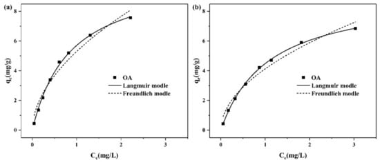 The adsorption isotherm is frequently applied to elucidate equilibrium adsorption experimental data. We just showed the adsorption isotherm of OA because NA only adsorbed very little ZEN due to its hydrophilic nature and strong polarity. Figure 8a,b reveals that the adsorption capacity of OA increased with the increase of ZEN concentration and gradually reached saturation. The Langmuir and Freundlich models were used to fit the equilibrium isotherm data. The Langmuir isotherm assumes that the adsorbate uniformly adsorbs to the surface of adsorbent to form a monolayer, which indicates that no further adsorption occurs once the specific sites of the adsorbent are filled [18]. The Langmuir equation is expressed as follows: