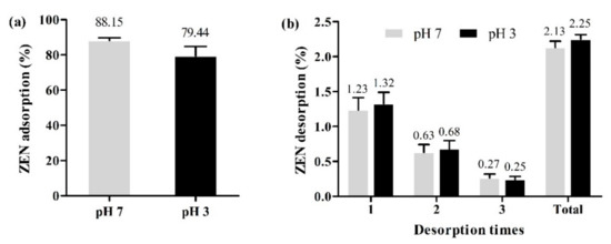 Adsorption (a) and desorption (b) of ZEN by OA at pH 7 and pH 3 (temperature = 37 °C; contact time = 60 min; adsorbent dose = 1.0 g/L, initial ZEN concentration = 5 mg/L; desorption time = 60 min).