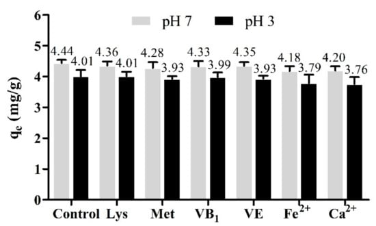 Amino acids, vitamins, and minerals are important nutrients in feed, which coexist with mycotoxins in contaminated feed. So, the effect of co-existing amino acids (i.e., Lys and Met), vitamins (i.e., VB1 and VE), and minerals (i.e., Fe2+ and Ca2+) on the adsorption of ZEN by OA was studied, and the results are shown in Figure 10. The removal efficiency of ZEN was not affected in the presence of Lys, Met, VB1, and VE, although decreased slightly in the presence of Fe2+ and Ca2+ at both of pH 7 and pH 3. These results demonstrate that OA had good adsorption selectivity for ZEN and was not affected by co-existing amino acids, vitamins, and minerals.