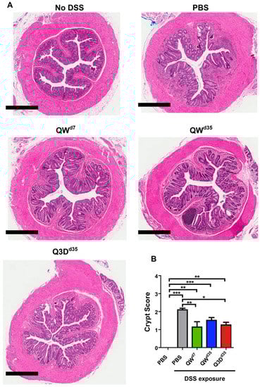 To further corroborate the above results, we performed a histopathological examination and evaluated the presence of active chronic colitis markers, particularly crypt structural alterations and expansion of the lamina propria, in hematoxylin and eosin (H&E)-stained distal colon tissues. By these metrics, CTB-KDEL-treated mice showed increased recovery from chronic DSS-induced colitis compared to vehicle control. QWd7 and Q3Dd35 dosing demonstrated similar but noteworthy recovery, exhibiting fewer instances of crypt branching, crypt distortion, and expansion of the lamina propria than QWd35 dosing (Figure 3A). It was indeterminable whether QWd7 or Q3Dd35 dosing had the greatest impact on recovery from chronic colitis. QWd35 dosing, however, still showed signs of recovery compared to vehicle control, as the latter displayed the most severe expansion of the lamina propria and crypt alterations (Figure 3A). These histopathological findings were quantified by a crypt score rating of the H&E-stained distal colon tissues. As shown in Figure 3B, all CTB-KDEL-treated groups had a significantly reduced crypt score, which was characterized by a reduction in the shortening or loss of basal crypts and epithelial surface retention in all CTB-KDEL-treated mice, in contrast to PBS treatment (Figure 3B).