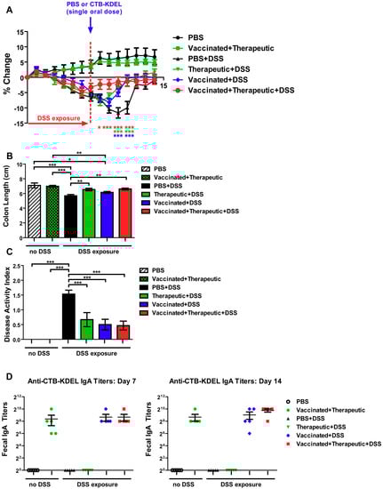 The impact of CTB-KDEL predosing on its therapeutic efficacy against DSS acute colitis in C3H/HeJ mice. C3H/HeJ mice were pre-dosed twice orally with 30 µg CTB-KDEL or PBS on Day −28 and Day −14 and then exposed to DSS on Days 0–7. A therapeutic dose of CTB-KDEL (3 µg) was dosed orally on Day 7. (A) Percent body weight change was monitored daily. Two-way ANOVA with Bonferroni’s multiple comparison tests were used to compare groups. * p < 0.05, ** p < 0.01, *** p < 0.001, compared to PBS + DSS group. (B) Disease activity index (DAI) at sacrifice on Day 14. (C) Colon length measured at sacrifice on Day 14. * p < 0.05, ** p < 0.01, *** p < 0.001. One-way ANOVA with Bonferroni’s multiple comparison tests. (D) Fecal anti-CTB-KDEL IgA titers were determined by ELISA on Day 14.