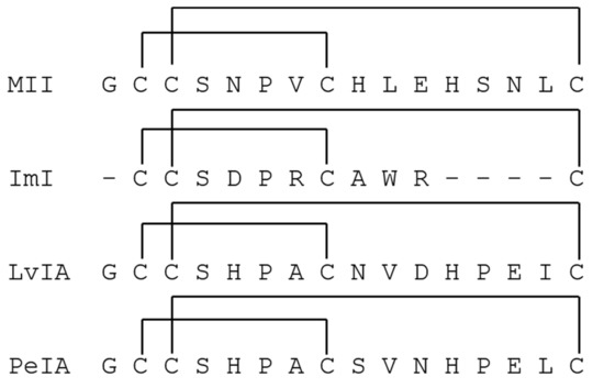 - Cartier, G.E.; Yoshikami, D.J.; Gray, W.R.; Luo, S.Q.; Olivera, B.M.; McIntosh, J.M. A new alpha-conotoxin which targets alpha 3 beta 2 nicotinic acetylcholine receptors. J. Biol. Chem. 1996, 271, 7522–7528. [Google Scholar] [CrossRef]