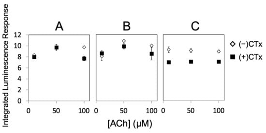 Integrated luminescence response versus ACh for (A) NGF(−), (B) NGF(+), and (C) NGF/nicotine. ACh response at 0 µM is not shown; the first point in each plot corresponds to the 10 µM ACh treatment to maximize visualization of data points and error bars.
