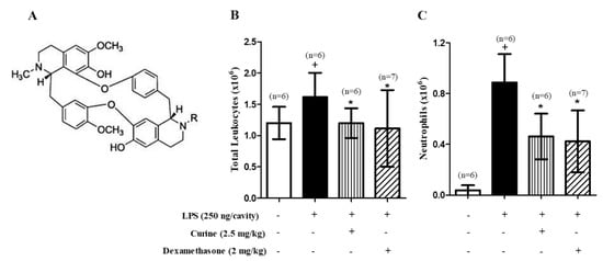 The bisbenzylisoquinoline alkaloids (BBA) constitute a group of secondary metabolites that exert numerous biological effects. The medicinal properties of BBA-rich plants and isolated compounds have been demonstrated in different experimental models, indicating that this class of substances presents promising anti-allergic and anti-inflammatory activities [,]. Our group found that curine, a BBA identified as the main constituent of Chondrodendron platyphyllum (Menispermaceae), is an orally active alkaloid with potent immunomodulatory effects and low toxicity, which therefore makes it a promising candidate in the development of new anti-inflammatory drugs [].