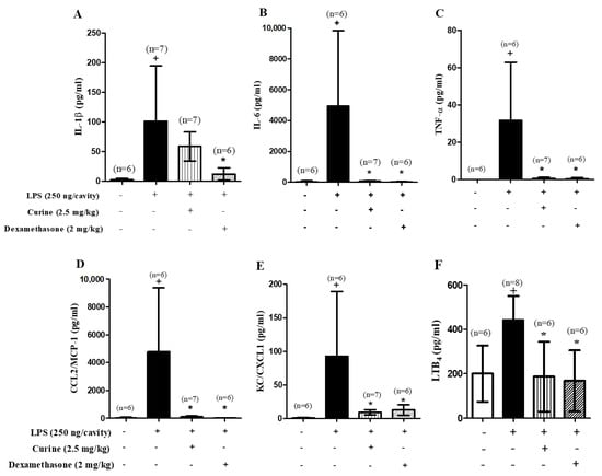 Effects of curine pre-treatment on in vivo cytokine production 4h after LPS challenge. Concentrations of interleukin (IL)-1β (A), IL-6 (B), tumor necrosis factor (TNF)-α (C), CCL2/monocyte chemotactic protein (MCP)-1 (D), keratinocyte-derived chemokine (KC/CXCL-1) (E) and leukotriene B4 (LTB4)(F) in the pleural lavages of C57Bl/6 mice orally pre-treated with curine (2.5 mg/kg) or dexamethasone (2 mg/kg). These results are expressed as the mean ± SD of at least 6 animals. + significant difference (p < 0.05) from the unchallenged group; * significant difference (p < 0.05) from the untreated LPS-challenged group. Statistical significance was determined with one-way ANOVA and post hoc Tukey test. Assay range of IL-1β: 10.36–60,631 pg/mL; IL-6: 0.74–12,053 pg/mL; TNF-α: 5.86–59,626 pg/mL; CCL2/MCP-1: 22.4–41,873 pg/mL; KC/CXCL1: 3.2–182 pg/mL and LTB4: 3.9–500 pg/mL.