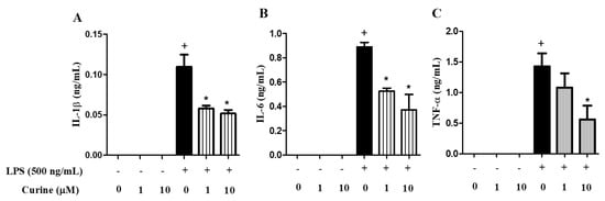 Effects of curine treatment on macrophage activation 4 h after LPS challenge. Concentrations of IL-1β (A), IL-6 (B) and TNF-α (C) in the supernatants of peritoneal macrophage cultures treated with curine (1 or 10 μM) 4h after the stimulus with LPS (500 ng/mL). Results are expressed as means ± Standard Error of Mean (SEM) of two experiments performed in triplicate. + significant difference (p < 0.05) from the unchallenged cells; * significant difference (p < 0.05) from the untreated LPS-challenged cells. Statistical significance was determined with one-way ANOVA and post hoc Tukey test. Assay range of IL-1β and IL-6: 15.6–1000 pg/mL and TNF-α: 31.3–2000 pg/mL.