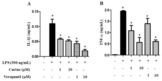 Effects of calcium influx inhibition on macrophage activation. Concentrations of IL-1β (A), TNF-α (B) in the supernatants of peritoneal macrophage cultures treated with curine or verapamil (1 or 10 μM) were evaluated 4 h after LPS challenge. Results are expressed as means ± SEM from two experiments performed in triplicate. + significant difference (p < 0.05) from the unchallenged cells; * significant difference (p < 0.05) from the untreated LPS-challenged cells. Statistical significance was determined with one-way ANOVA and post hoc Tukey test. Assay range of IL-1β: 15.6–1000 pg/mL and TNF-α: 31.3–2000 pg/mL.