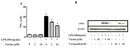 It has been demonstrated that LPS stimulates the synthesis of NO via IL-1β, TNF-α, and IFN-γ []. Figure 5A illustrates the effects of curine on NO production. The supernatants of LPS-stimulated peritoneal macrophages presented significantly increased concentrations of nitrite, which was significantly decreased by curine treatment. Moreover, while LPS stimulation was found to induce increased expression of iNOS by macrophages, treatment with curine or verapamil reduced the expression of this enzyme (Figure 5B). These findings suggest that the inhibition of NO production through the curine-mediated regulation of iNOS expression could be associated with calcium influx inhibition.