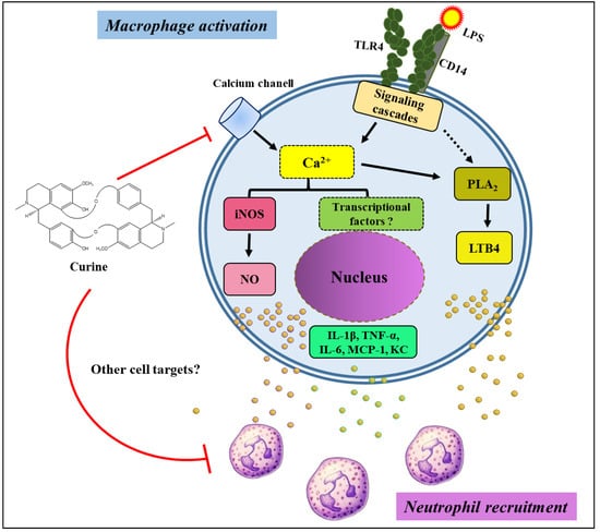 Schematic diagram illustrating a potential mechanism of action by curine on macrophage activation and neutrophil recruitment. The inhibition of calcium influx could be affecting signaling pathways associated with the synthesis of NO, LTB4 and cytokines, which could impair neutrophil recruitment. Importantly, the possibility that curine may interfere with other cell targets cannot be ruled out.
