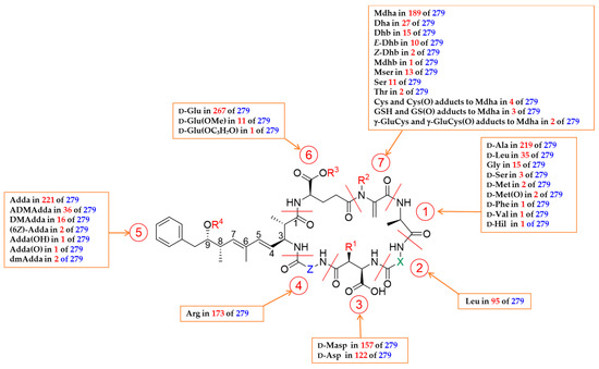 The amino acid residue in position 7 is also variable; however, it is not as diverse as those in positions 2 and 4. N-methyldehydroalanine (Mdha) is found in position 7 in 189 of the 279 reported MCs (Table 1). However, other amino acids have been reported in this position, including dehydroalanine (Dha) [33,83,108,109,138,161], dehydrobutyrine (Dhb) [75,77,79,91,142], N-methyldehydrobutyrine (Mdhb) [78], Ser [33,84,102,138,152,161], N-methylserine (Mser) [80,82,86,88,93,108,109], Thr [171], and conjugates formed by addition of Cys, γ-GluCys and glutathione (GSH) with the reactive double bond of Mdha7 [80,81]. Chemical and metabolic transformations of MCs are discussed in Section 5.7.