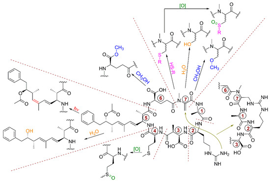 Examples of chemical reactions of MCs demonstrated using the hypothetical congener [ADMdda5]MC-RM. The numbers in circles indicate the amino acid residue-number.