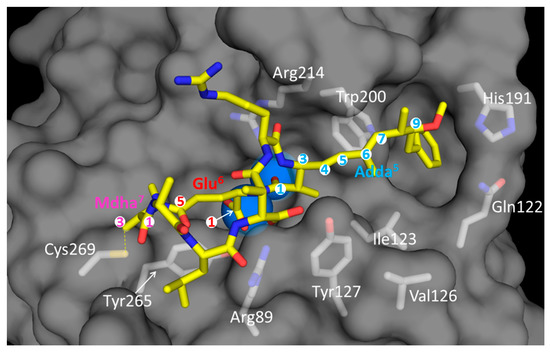 X-ray crystallographic structure showing the interaction of microcystin-LR (MC-LR) with the PP2A catalytic subunit and its adjacent amino acid side chains (based on data provided in [257]). Important interactions are described in the text (Section 6.2). The Mdha7, D-Glu6 and Adda5 moities, and selected atoms in these amino acids, are labelled in magenta, red, and pale blue, respectively. The large blue spheres are the catalytic metal ions, and the dashed yellow line shows the location of the covalent bond formed over time between the thiol of Cys269 and the Mdha7 moiety of MC-LR.
