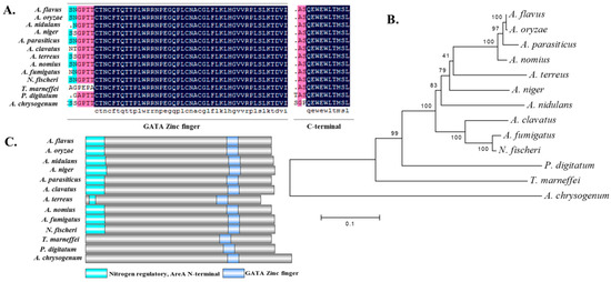 Bioinformatics analysis of major nitrogen regulator AreA. (A) Sequence alignment of the AreA protein amino acid sequence from Aspergillus flavus, Aspergillus oryzae, Aspergillus nidulans, Aspergillus niger, Aspergillus parasiticus, Aspergillus clavatus, Aspergillus terreus, Aspergillus nomius, Aspergillus fumigatus, Neosartorya fischeri, Talaromyces marneffei, Penicillium digitatum and Acremonium chrysogenum, showing the conserved domains. (B) Phylogenetic tree of the AreA protein from organisms described in panel A. (C) Domain prediction of the AreA protein in the aforementioned organisms visualized by DOG 2.0 software.