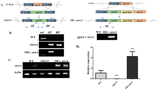 2.2. Construction of areA Deletion (ΔareA) and Over-Expression (OE::areA) Mutant Strains