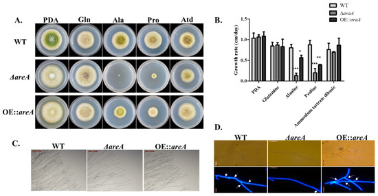 2.3. areA is Important for Nitrogen Utilization and Growth of A. flavus
