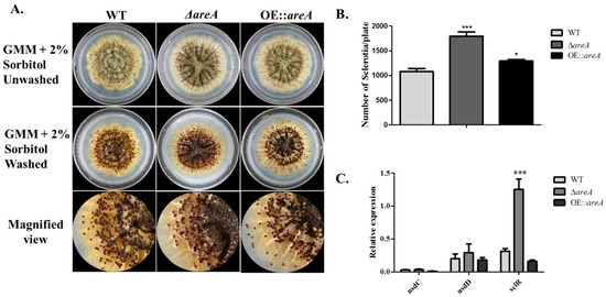 Sclerotia production of A. flavus strains. (A) Sclerotia production (before and after washing off the conidia) of the WT, ΔareA and OE::areA strains on glucose minimal medium (GMM) at 37 °C. (B) Statistical analysis of the sclerotia production. (C) The expression levels of nsdC, nsdD and sclR genes involved in sclerotia production by qRT-PCR assay. * p 0.05 and *** p 0.001. Error bars represent the SE from three independent experiments with three replicates.
