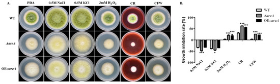 Inhibition of the growth rate of A. flavus strains under different stress conditions. (A) Colony morphology of the WT, ΔareA and OE::areA strains grown on PDA, or PDA containing 0.5 mol/L NaCl and KCl, 3 mM H2O2, 300 μg/mL Congo Red (CR), and 100 μg/mL calcofluor white (CFW) at 37 °C for 4 d, respectively. (B) The inhibition of the growth rate of the strains in panel A. * p 0.05 and *** p 0.001.