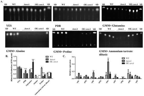 AF extraction was carried out from A. flavus liquid cultures in YES, PDB, and GMM supplemented with 50 mM nitrogen sources, and analyzed using a previously described TLC (thin layer chromatography) method [63].