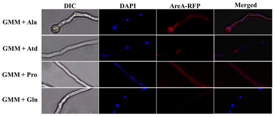 The localization strain AreA::RFP, in which areA was tagged with RFP, was constructed using the homologous recombination method. The RFP gene was tagged to the end of the areA gene, just before its stop codon, so that RFP would be expressed alongside areA. A vector containing the areA coding region, RFP, pyrG, and the 3′ flanking sequence of areA was constructed and transformed into SRRC1709 protoplasts. The fragments were amplified using the following primer pairs: AR-F/AR-R, RFP-F/RFP-R, pyrG-F/pyrG-R, and areA-BF/areA-BR for areA coding region, RFP, pyrG, and the 3′ flanking sequence of areA, respectively. The AreA::RFP strain was cultured in 1.5 mL EP tubes containing 500 µL GMM, supplemented with different nitrogen sources, 50 mM (Gln, Ala, Pro, and NH4), at 37 °C for 16 h, in a shaker. The medium was discarded from the tubes, and hyphae were crushed and washed with phosphate buffer saline (PBS) at least 3 times. Then, 1 mg/mL 4,6-diamidino-2-phenylindole (DAPI) was added to the tubes now containing PBS, and incubated on ice for 15 min, away from light. Hyphae were picked onto glass slides and viewed under a confocal microscope.
