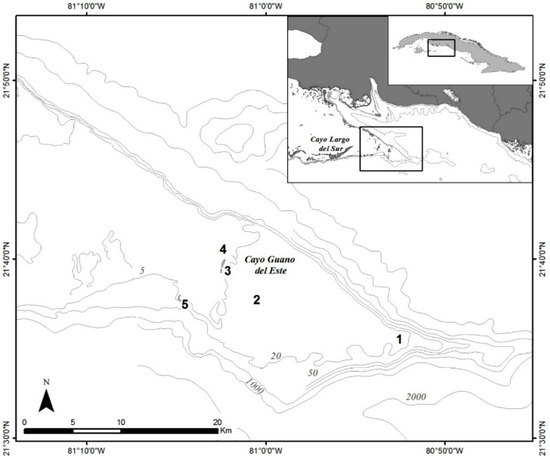 In December 2016, we sampled a reef off the coast of south-central Cuba in Puntalón, a bank known by local residents to be unsafe due to risk of ciguatera (Figure 1). The nearest cay to this area is Cayo Guano del Este. Other cays are found successively to the west toward Cayo Largo del Sur, a small resort island where coral reefs constitute one of the main attractions for tourists. Five sampling sites were selected to encompass depths between 5 to 10 m (sites 2, 3 and 4) or up to 20 m (sites 1 and 5) (Figure 1) to increase the probability to detect different Gambierdiscus species, particularly those that may be toxic [55].
