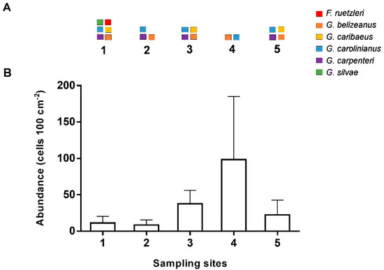 Quantitative polymerase chain reaction (qPCR) assays detected six species associated with screen or Dictyota substrates, and included Gambierdiscus caribaeus, G. belizeanus, G. carpenteri, G. carolinianus, Fukuyoa ruetzleri, and G. silvae. The species G. carolinianus and G. belizeanus were found in all sampling sites while G. caribaeus and G. carpenteri were found in three and four of the five sites, respectively. Site 4 had the highest abundance, yet the lowest diversity of Gambierdiscus. Fukuyoa ruetzleri and G. silvae were found only at site 1 and only on the Dictyota sample (Figure 2A). Species composition was highly variable among replicate screens within sites. Because qPCR estimates were at the lower end of the detection range, uncertainty prevents reporting individual values. However, these low abundances from qPCR were in correspondence with the low total visual counts (Figure 2B).