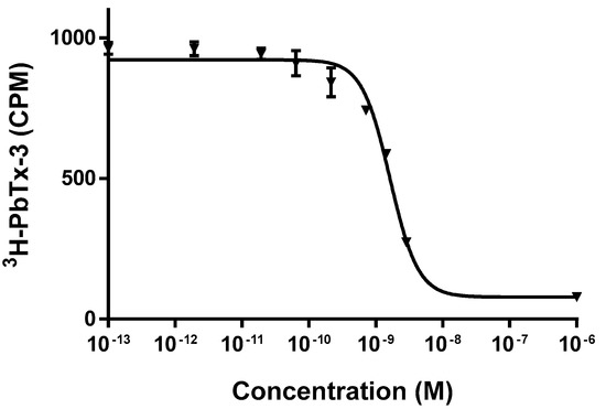 Representative dose response curve for CTX3C standard by the receptor binding assay (RBA). Each point represents the mean ± standard error (SEM) of triplicate values for a single experiment.
