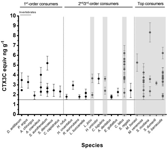 Toxicity of sampled fish and invertebrate specimens (Mean ± SD of replicate RBA analyses). Carnivorous species are arranged by increasing trophic level. The horizontal line corresponds to the RBA limit of quantification (LOQ = 1.5 ng CTX3C equiv. g−1). RBA− specimens are not shown. Shaded areas indicate fish species banned by Cuban regulation. These data are represented in a box and whiskers plot as Supplementary Information (Figure S1). Shaded areas indicate fish species banned by Cuban regulation.