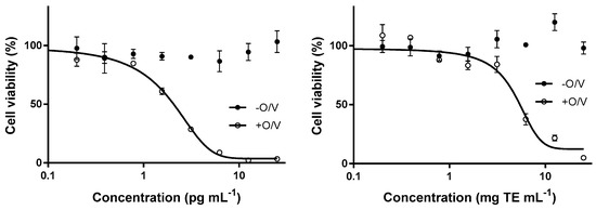 CTX1B standard curve (left) and a fish extract analyzed by cell-based assay (CBA-N2A, right). The extract illustrated here is a Seriola rivoliana specimen and demonstrates ciguatoxin-like activity (cytotoxicity exclusively in the presence of O/V) corresponding to an estimated 0.362 ng CTX1B equiv. g−1. Each point represents the mean ± SEM of triplicate values for a single experiment. O: ouabain; V: veratridine.