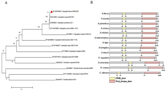 Bioinformatics analysis of the mitogen-activated protein kinase (MAPK) pathway kinase AflSte20 from 13 different fungi: A. flavus (XP 002375063.1), A. oryzae (OOO10620.1), A. parasiticus (KJK64622.1), A. nomius (XP_015407688.1), A. nidulans (XP_659671.1), A. heteromorphus (XP_025396092.1), A. niger (XP_001394427.1), A. fumigatus (XP_749600.2), A. steynii (XP_024710913.1), Penicillium roqueforti (CDM34572.1), S. cerevisiae (DAA06681.1), Neurospora crassa (XP_011394882.1) and Candida albicans (EEQ46270.1). (A) Phylogenetic relationship of Ste20 homologs from different species was analyzed by MEGA 7.0. Neighbor joining with a bootstrap of 1000 replicates was used to generate the phylogenetic tree. (B) Conserved domain analysis of the fungi AflSte20 proteins. InterPro (http://www.ebi.ac.uk/interpro/scan.html) and IBS 1.0 were used in the analysis.
