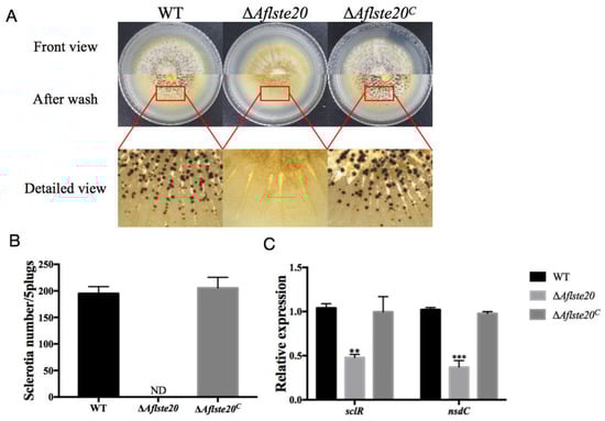 The role of Aflste20 in sclerotia formation in A. flavus. (A) Phenotypes of the WT, ∆Aflste20, and ∆Aflste20C strains were observed after grown on a WKM medium for 7 days in the dark. The mycelia were cleaned with 75% ethanol to make sclerotia visible. (B) The number of sclerotia from WT, ΔAflste20, and ΔAflste20C strains. (C) The expression level of sclR and nsdC genes in A. flavus by qRT-PCR analysis. For panels (B) and (C), each bar indicates the mean ± standard deviation (SD) of three replicate assay experiments. ** represents significant difference (p < 0.01), and *** represents significant difference (p < 0.001).