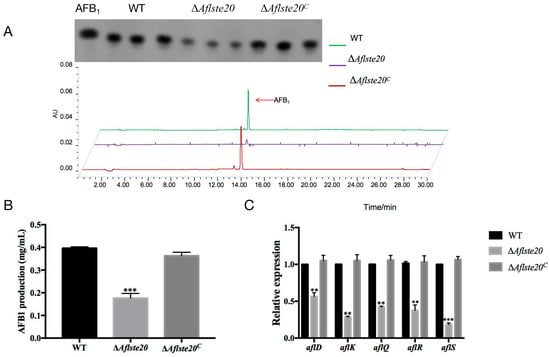Role of Aflste20 in aflatoxin biosynthesis. (A) thin-layer chromatography (TLC) and high-performance liquid chromatography (HPLC) analysis of AFB1 production in WT, ∆Aflste20, and ∆Aflste20C strains after 7 days of incubation. (B) Relative AFB1 production was calculated from (A). (C) The qRT-PCR analysis of the expression of key structure genes (aflD, aflK, aflQ, aflR, and aflS) in A. flavus. Bars in panels (B) and (C) indicate the mean ± standard deviation (SD) of assays performed three times. ** represents significant difference (p < 0.01), and *** represents significant difference (p < 0.001).