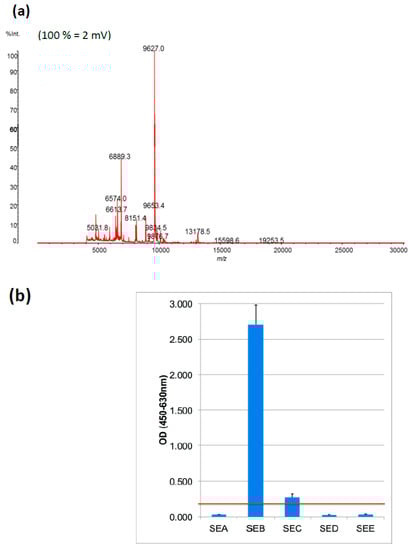 The protocol of using MALDI-TOF MS for secreted SEB provides several advantages. Previous studies identified fragments, rather than intact forms, of the SEA and SEB toxins by MALDI-TOF MS or LC-MS/MS [16,25]. Their method was laborious due to the need for trypsin digestion of SE into fragments of 0.8 to 2.4 kDa, and it was thus relevant mainly only for research purposes. For example, we applied the trypsin-digestion sample preparation for the identification of SEB by sequence analysis. The sample preparation of fragments of SE was significantly longer (several hours) and more laborious than the sample preparation of intact SE using a simple precipitation (completed within minutes). The protocol of MALDI-TOF MS is also advantageous with respect to the commercial ELISA analysis of SE due to its low operational costs.