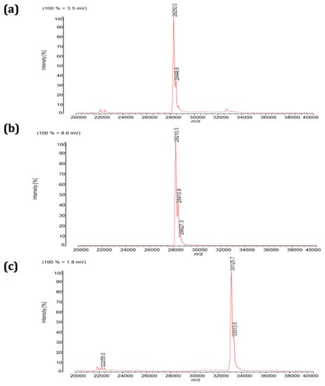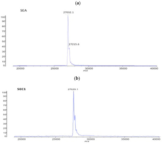 The SE test was further applied to enterotoxins SEA and SEC. Their authentic references were detected at the intact size of SEA at m/z 27,032 and at the intact size of SEC at m/z 27,629 (Figure 4). The peak m/z 27,032 corresponds to 27.1 kDa for SEA [20] and m/z 27,629 corresponds to 27.53 kDa for SEC [21]. These findings show that the identification of an array of SE, including SEA to SEC, is obtained by the here-established MALDI-TOF MS analysis.