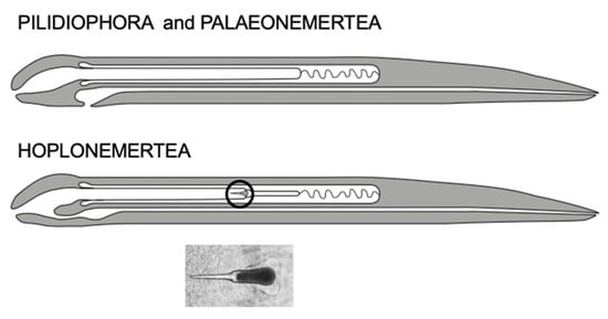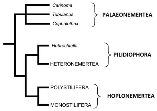 The classification of nemerteans has been in constant flux, both at the intra-phylum level and with respect to the position of the phylum among the metazoans. Relations between higher taxa are not steadily positioned within a phylogenetic framework and some taxonomic groups within Nemertea are clearly not monophyletic. Traditionally, the two suborders, Anopla and Enopla, have been used following Johnston’s (1837) [12] grouping that is based primarily on the absence or presence of the stylet apparatus in the proboscis. Recently, these suborders were dismissed [13] and instead three classes (natural groups) are maintained from the compiled evidence of the last 15 years: Palaeonemertea, Pilidiophora, and Hoplonemertea. The main morphological features that are used for further classification are muscle layers in the body wall, armament of proboscis (Hoplonemertea), and placement of mouth opening.