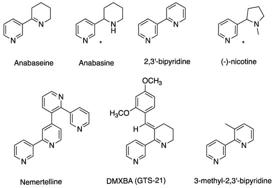 Taken together, this provided rationale in understanding the effects of a series of cinnamylidene and benzylidene derivative of anabasine, among them 3-(2,4-dimethoxybenzylidene)-anabaseine or DMXBA [46], also known as GTS-21 [47]. It is the anabaseine derivative that has come closest to medicinal application. DMXBA shows long-term potentiation via the selective binding to CNS α-7 nicotinic acetylcholine receptors [47]. This sparked interest by the similarity to effects of nicotine on memory-related behaviours, specifically Alzheimer’s disease [48]. DMBXA showed promising results in eyeblink classical conditioning (EBCC), a rabbit model to parallel aging in humans [49]. It was also shown to improve memory-related behaviour in Sprague–Dawley rats [50]. DMXBA in Alzheimer’s has been reviewed by Zawieja et al. [51], and Kem et al. reviewed studies on the use of anabaseine and DMXBA against memory loss and schizophrenia [46]. A comprehensive paper by Rangel and Falkenberg discussed the recent status of clinical trials with regard to compounds of marine origin and their derivatives in the pharmaceutical pipeline [52]. As of January 2019, eight studies regarding DMXBA are listed in ClinicalTrials.gov, but no outcome is reported.
